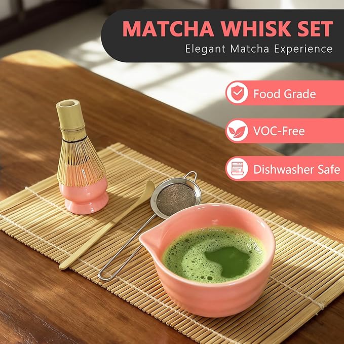 - COMPLETE SET: Includes a 18 oz ceramic matcha bowl, bamboo whisk (chasen), whisk holder, ceramic whisk stand, and stainless steel sifter for perfect matcha preparation