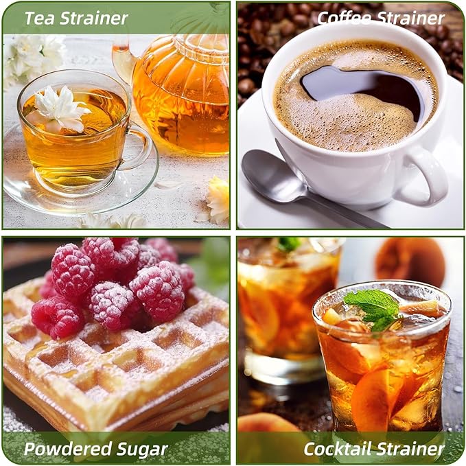 - Application: Strains Tea coffee grounds perfectly, very fine mesh. Ideal for straining liquids like teas, coffee, cocoa, cocktails and juices. Besides, the elegant design, functionality, and premium materials make strainer a unique and practical gift.
